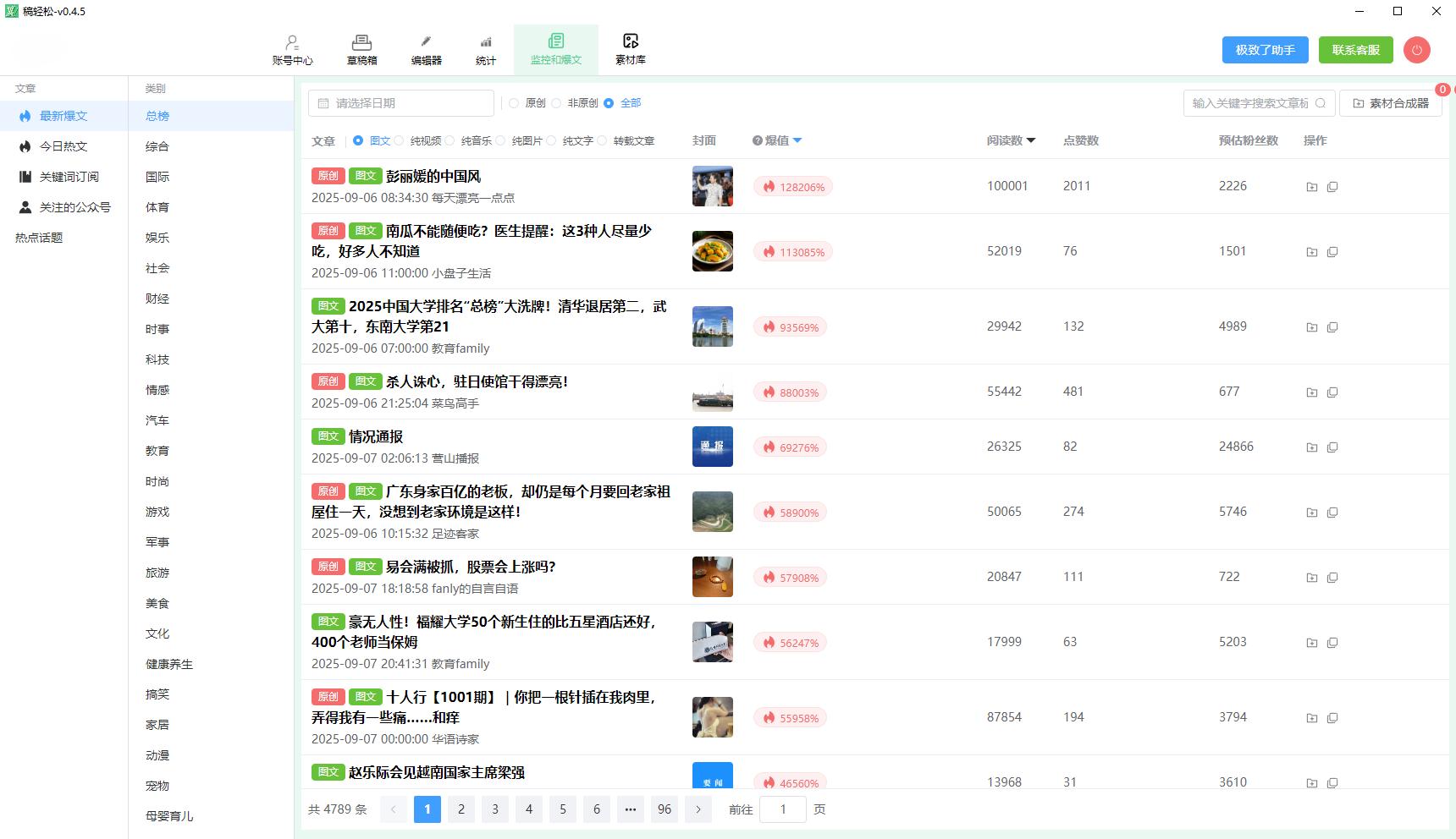 打开稿轻松编辑器,在顶部导航栏找到「爆文与监控」按钮,点击即可进入功能中枢。这里整合了全网公众号资源,通过数据可视化看板直观呈现28个细分领域的实时动态,从科技到情感,从教育到美食,你关注的领域热点一目了然。无需在多个平台间切换,一个界面搞定所有爆款内容追踪。