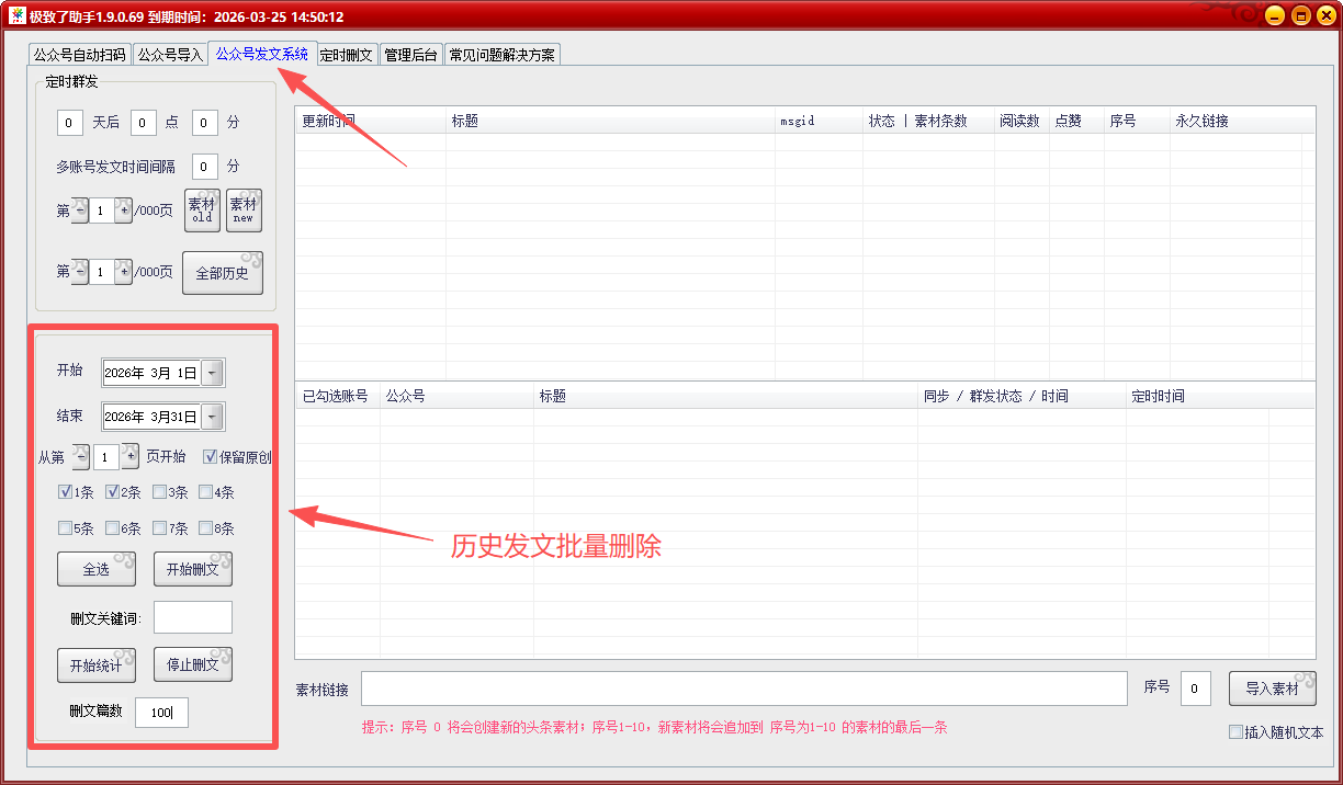 本版本的历史删文功能在[公众号发文系统]里,如上图所示位置,在导入公众号列表中选中要删除的公众号后,设置好开始和结束的时间,删除每次发文的条数,需要保留原创的勾选[保留原创],还可以设置关键词删文,全部设置好后,点击开始删文,软件会自动开始删文。