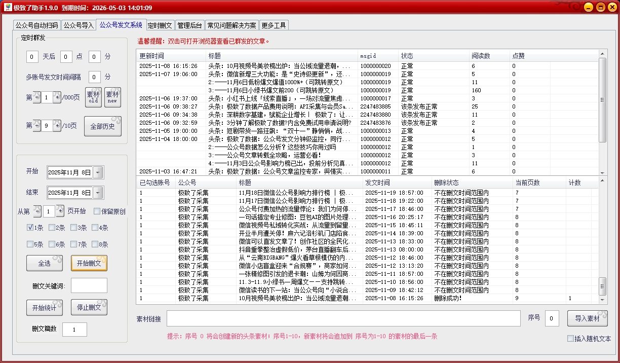 - 9、导入公众号成功后,点击[定时删文],选择你要删文的公众号,设置文章开始时间和结束时间